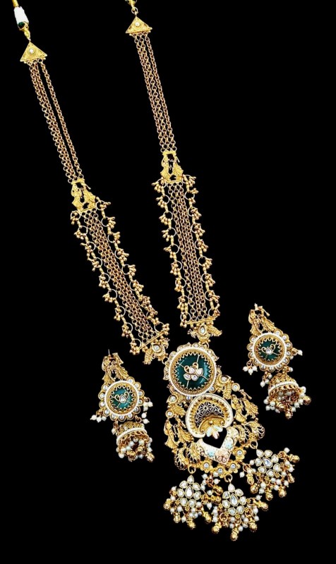 Elevate your elegance with this exquisite traditional Indian necklace set, expertly handcrafted and finished in luxurious gold plating. Rich purple and vibrant green enamel accents create a striking contrast, while dazzling stones and luminous pearls add a touch of opulence. The set includes matching earrings adorned with delicate hanging charms, making it the perfect accessory for weddings, festive celebrations, and special occasions. Necklace length: approximately 18 inches; earring drop: 2.5 inches. Colors: gold, purple, green, white. Wear this timeless set and turn every moment into a celebration.