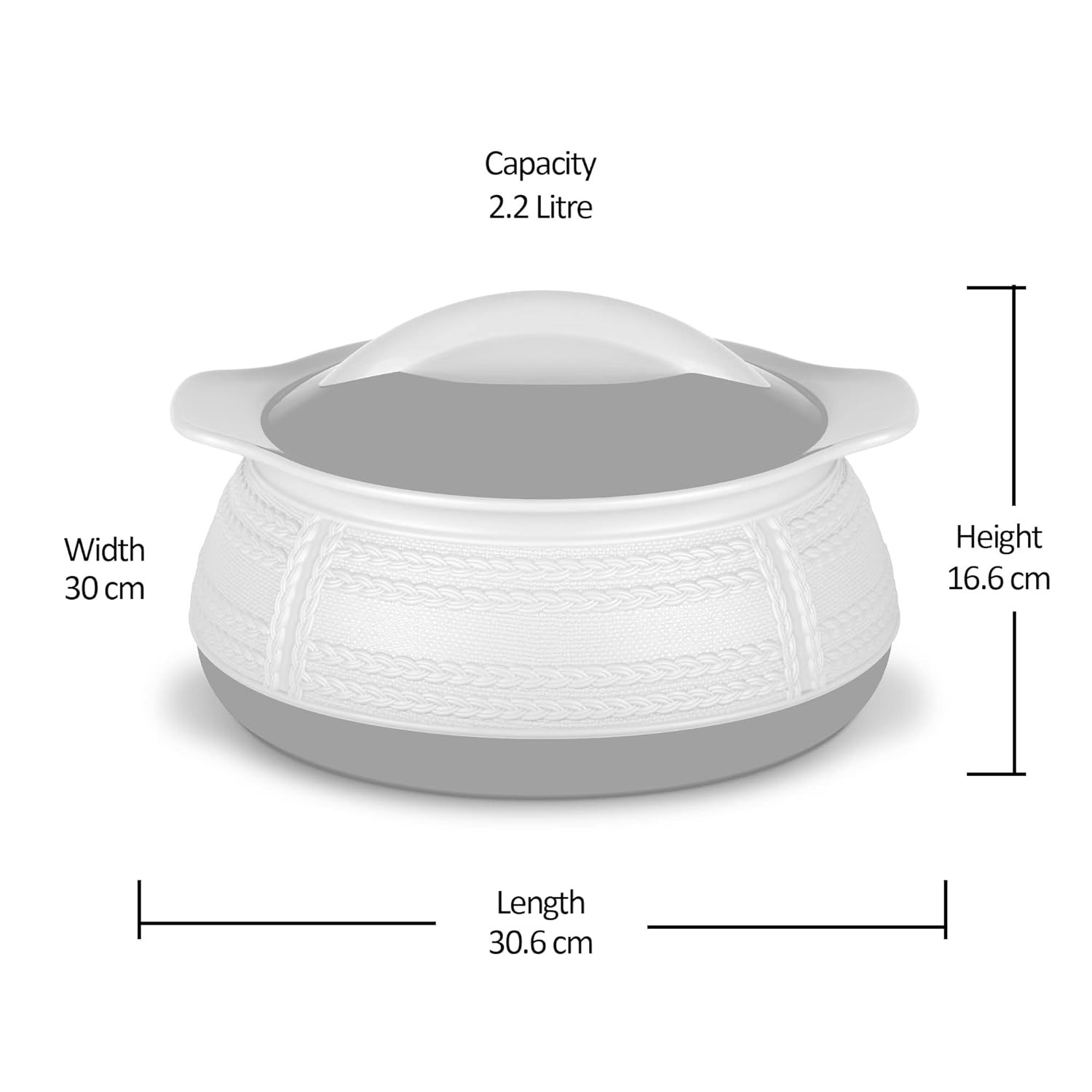 • Colour: Beige; Material: Inner Stainless Steel; Package Contents: 1 - Piece Adore Casserole (2.2 Litres); Product Dimension in cms (L x W x H) (30.6 x 30 x 16.6); For any query/assistance please contact us.