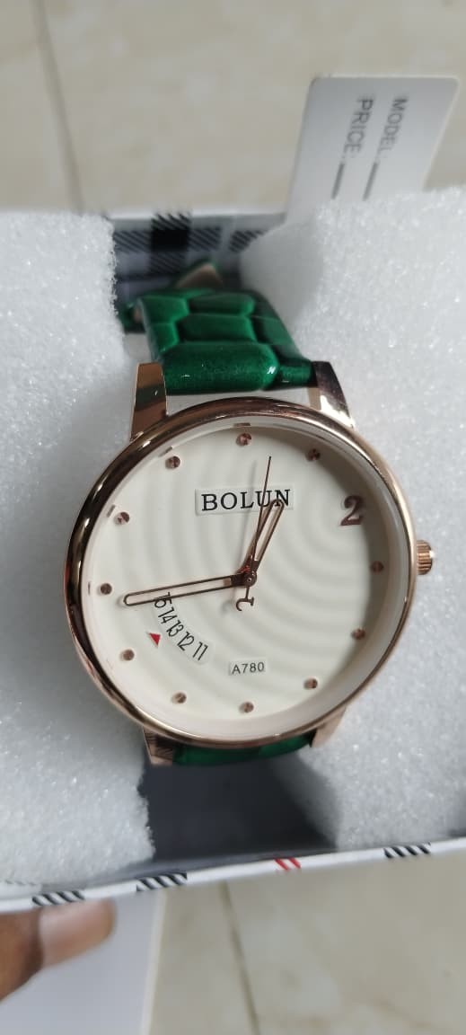 Elevate your style with the Bolun Classic Wristwatch, crafted to make every moment stand out. Featuring a luxurious rose gold-toned case paired with a crisp white dial highlighted by shimmering gold accents, this watch blends elegance and sophistication. The eye-catching green textured strap adds a unique touch of modern flair, perfect for both casual outings and formal events. With a comfortable 38mm case size designed to fit most wrists, durable mineral glass, and an easy-to-use buckle clasp, this versatile timepiece is the ideal accessory for any occasion.