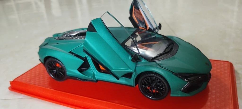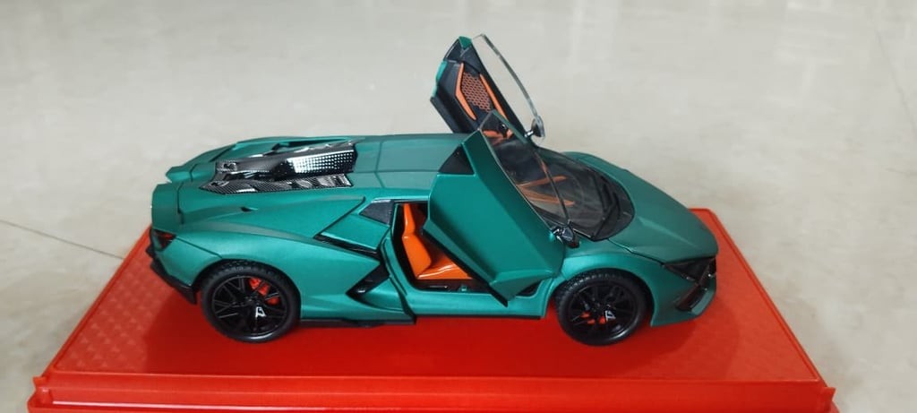 Experience the thrill of owning a Lamborghini with this precision-engineered diecast sports car model, featuring a vibrant green exterior, stunning orange seats, and striking black wheels. The model boasts finely crafted details, including a realistic interior and authentic scissor doors that open gracefully, bringing true-to-life excitement to collectors and car enthusiasts alike. Measuring approximately 7 inches in length, this eye-catching piece is the perfect addition to any display shelf or desktop.