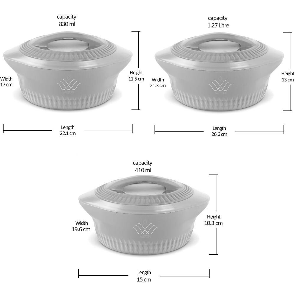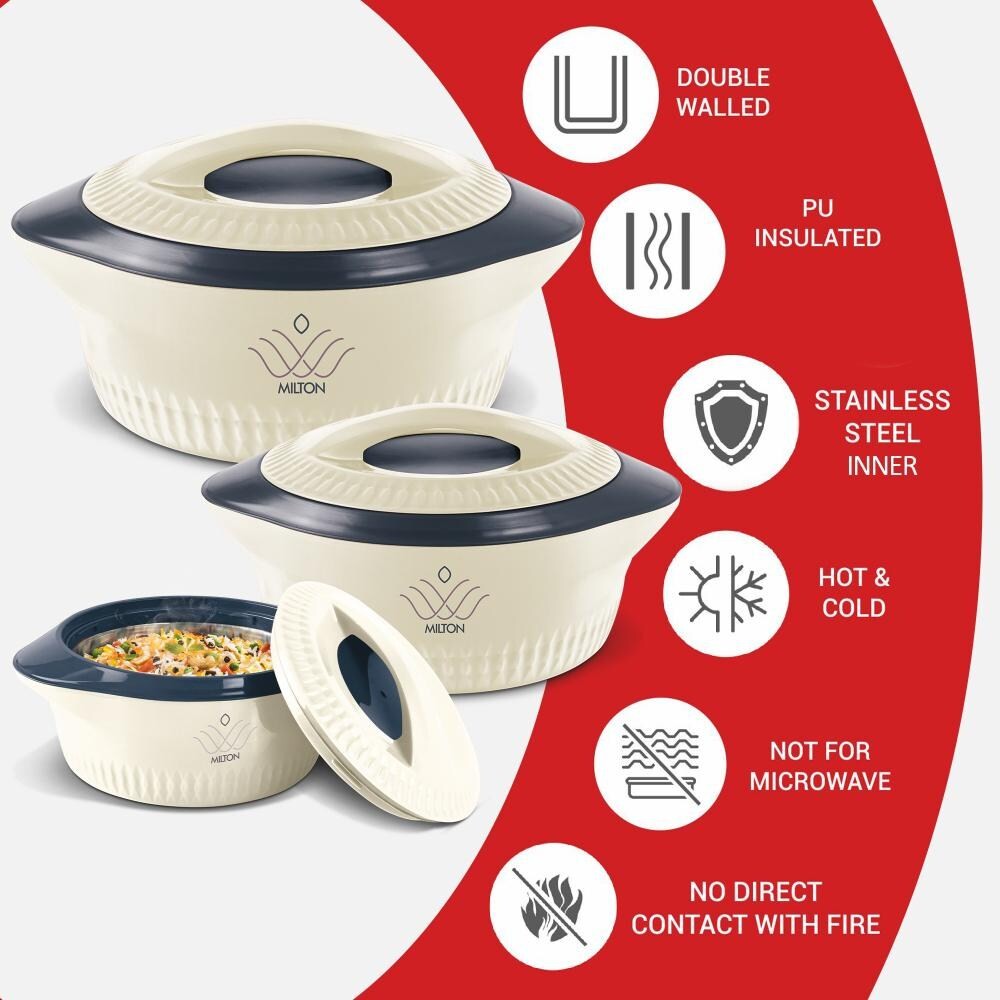 • Colour:  CREAM ; Material: Inner Stainless Steel; Package Contents: 3 - Pieces Royal Casserole (830 ml, 1.27 Litres, 1.8 Litres); Product Dimension in cms (L x W x H) 830 ml - (22.1 x 17 x 11.5), 1.27 Litres - (26.6 x 21.3 x 13), 1.8 Litres - (30 x 24 x 14)