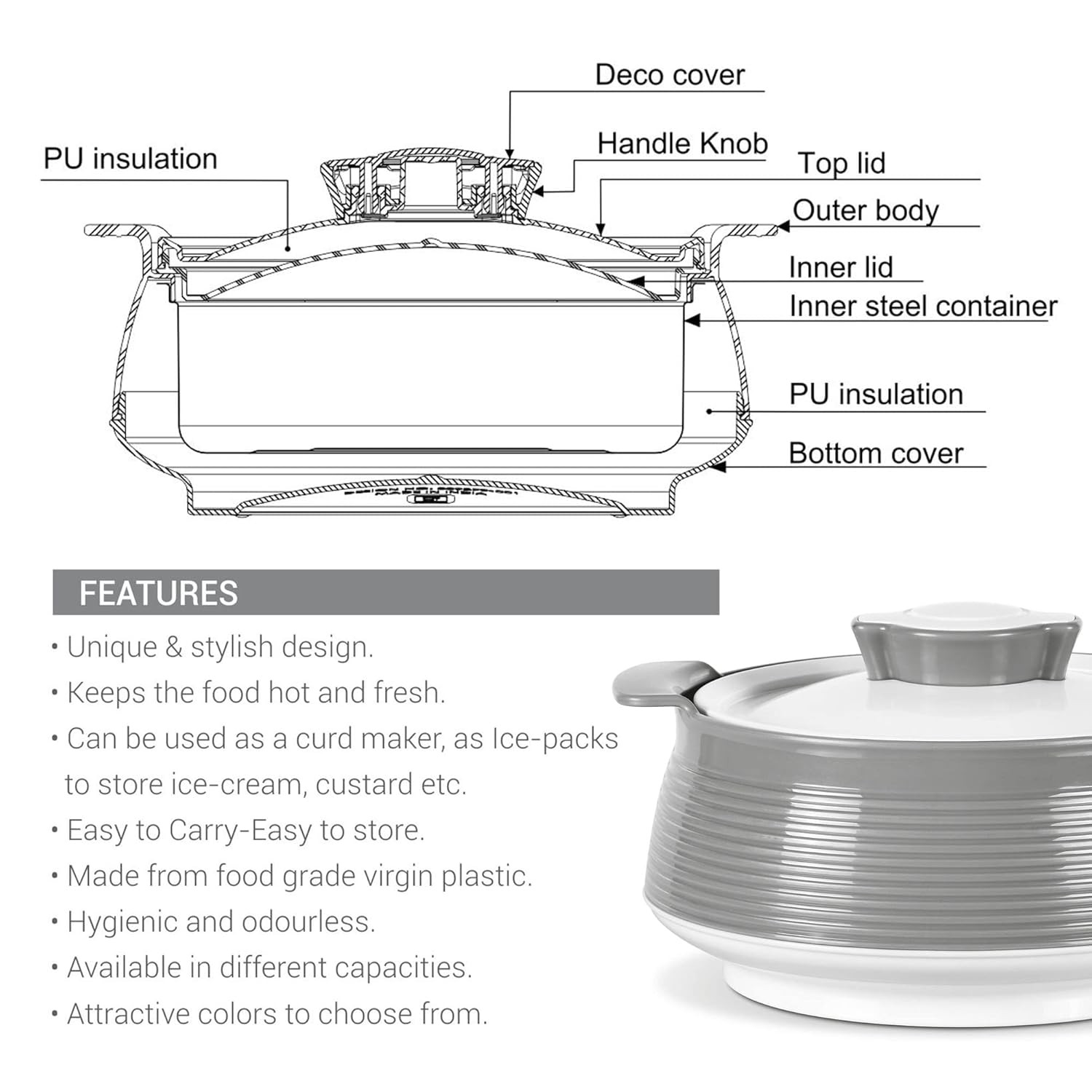 • Double walled Inner stainless steel casserole keeps food hot and fresh for hours. The refined pastel colours and the striking design elevates your dining décor and thus makes it a must-have casserole for your home.