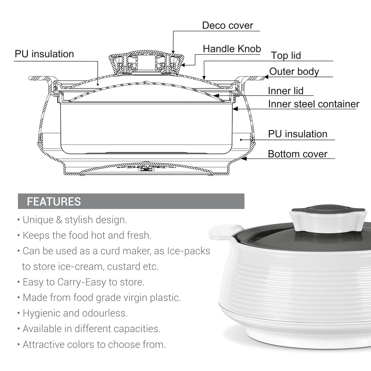 • Double walled Inner stainless steel casserole keeps food hot and fresh for hours. The refined pastel colours and the striking design elevates your dining décor and thus makes it a must-have casserole for your home.