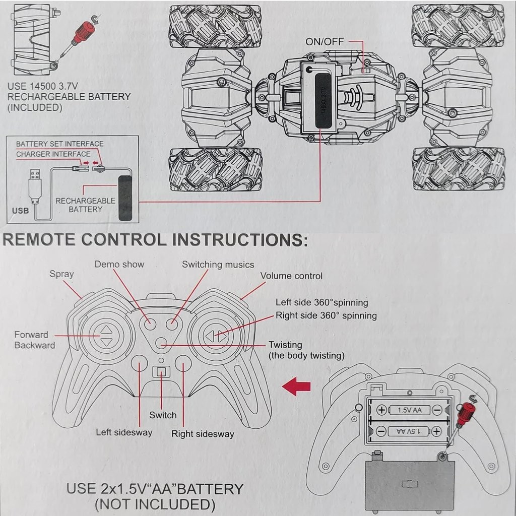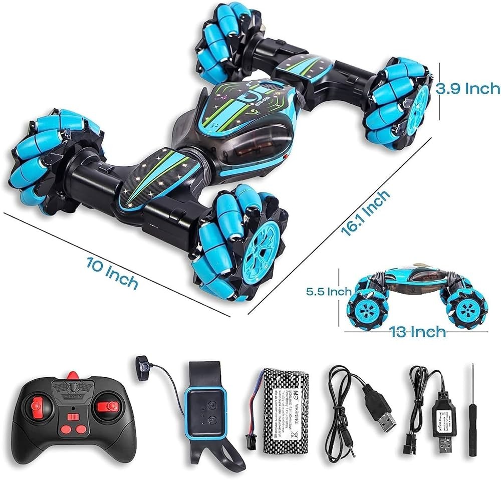Experience the thrill of high-speed stunts with the 4WD Gesture Sensing RC Stunt Car! Engineered for maximum excitement, this versatile RC car combines traditional remote control with innovative gesture sensing technology—just wave your hand and watch it spin, flip, and conquer any terrain. Perfect for both indoor and outdoor adventures, it features a powerful rechargeable battery, durable 4-wheel drive, and comes complete with a USB charger, ergonomic remote controller, and a wearable sensor for effortless gesture operation. Available in sleek red and blue finishes and measuring approximately 12 inches long, this stunt car is the ultimate gift for kids and RC enthusiasts alike.