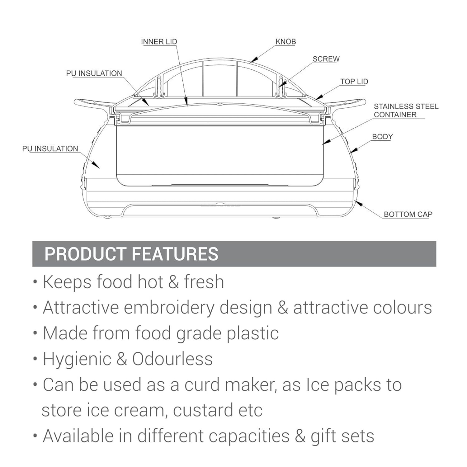 • Double walled Inner stainless steel casserole keeps food hot and fresh. Integrated side handles allows easy to carry from kitchen to dining table.