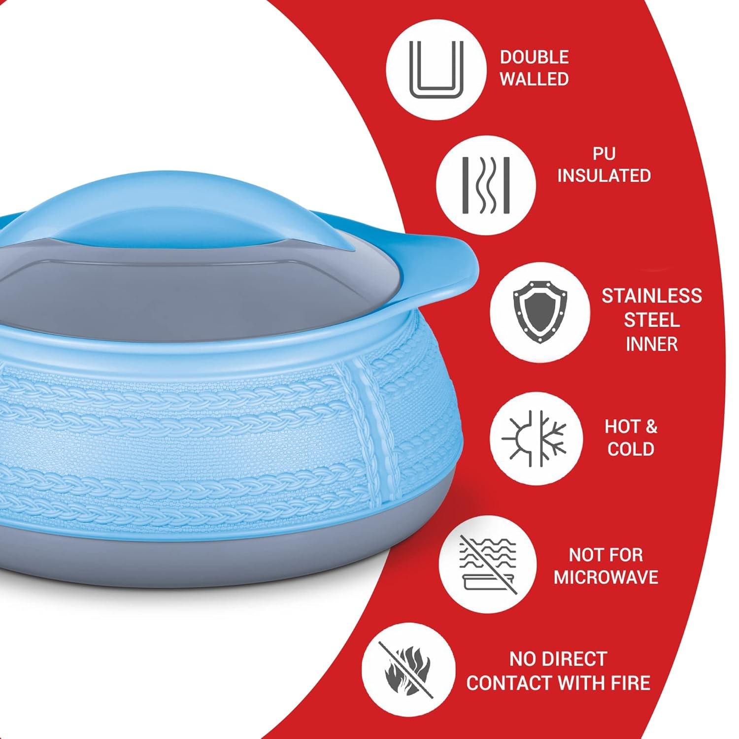 • Colour: BLUE ; Material: Inner Stainless Steel; Package Contents: 1 - Piece Adore Casserole (2.2 Litres); Product Dimension in cms (L x W x H) (30.6 x 30 x 16.6); For any query/assistance please contact us.