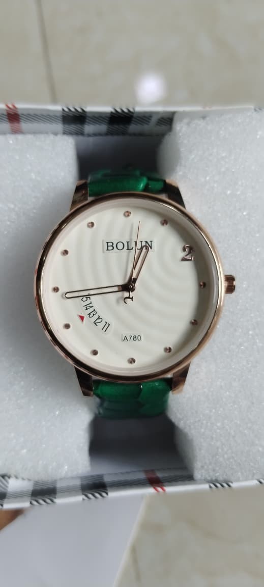Elevate your style with the Bolun Classic Wristwatch, crafted to make every moment stand out. Featuring a luxurious rose gold-toned case paired with a crisp white dial highlighted by shimmering gold accents, this watch blends elegance and sophistication. The eye-catching green textured strap adds a unique touch of modern flair, perfect for both casual outings and formal events. With a comfortable 38mm case size designed to fit most wrists, durable mineral glass, and an easy-to-use buckle clasp, this versatile timepiece is the ideal accessory for any occasion.