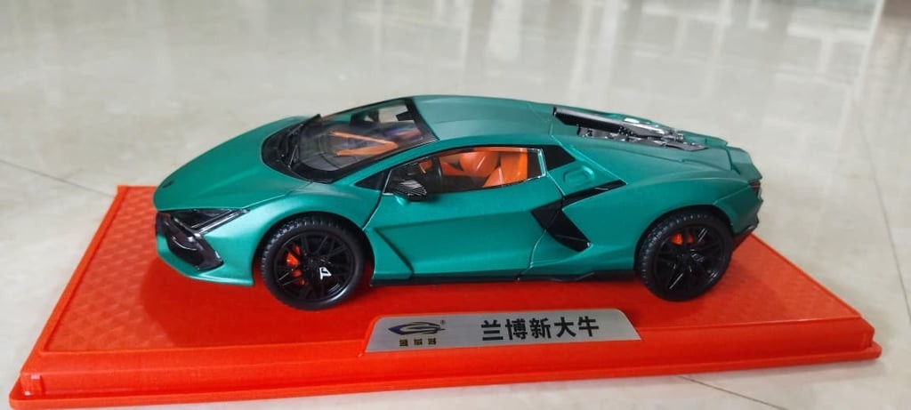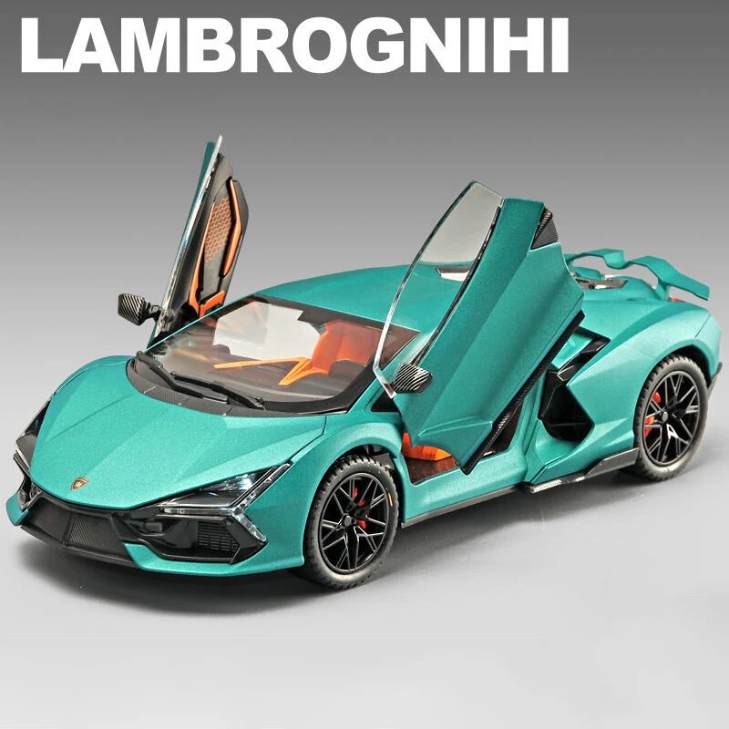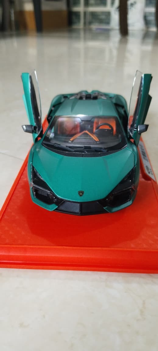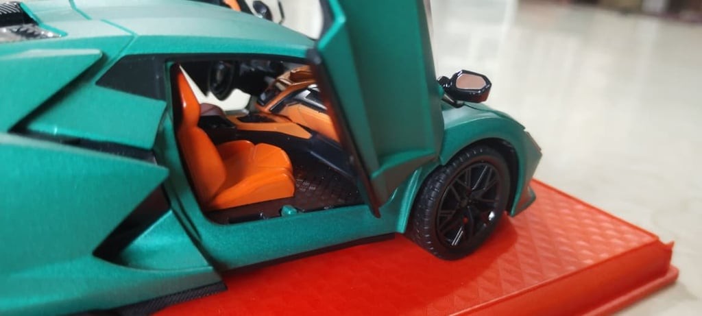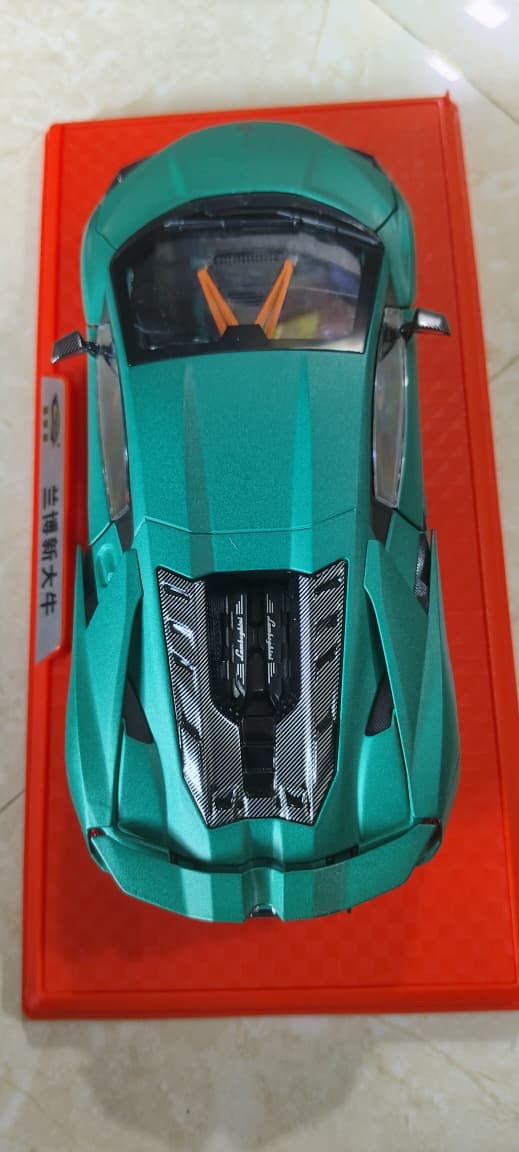 Experience the thrill of owning a Lamborghini with this precision-engineered diecast sports car model, featuring a vibrant green exterior, stunning orange seats, and striking black wheels. The model boasts finely crafted details, including a realistic interior and authentic scissor doors that open gracefully, bringing true-to-life excitement to collectors and car enthusiasts alike. Measuring approximately 7 inches in length, this eye-catching piece is the perfect addition to any display shelf or desktop.