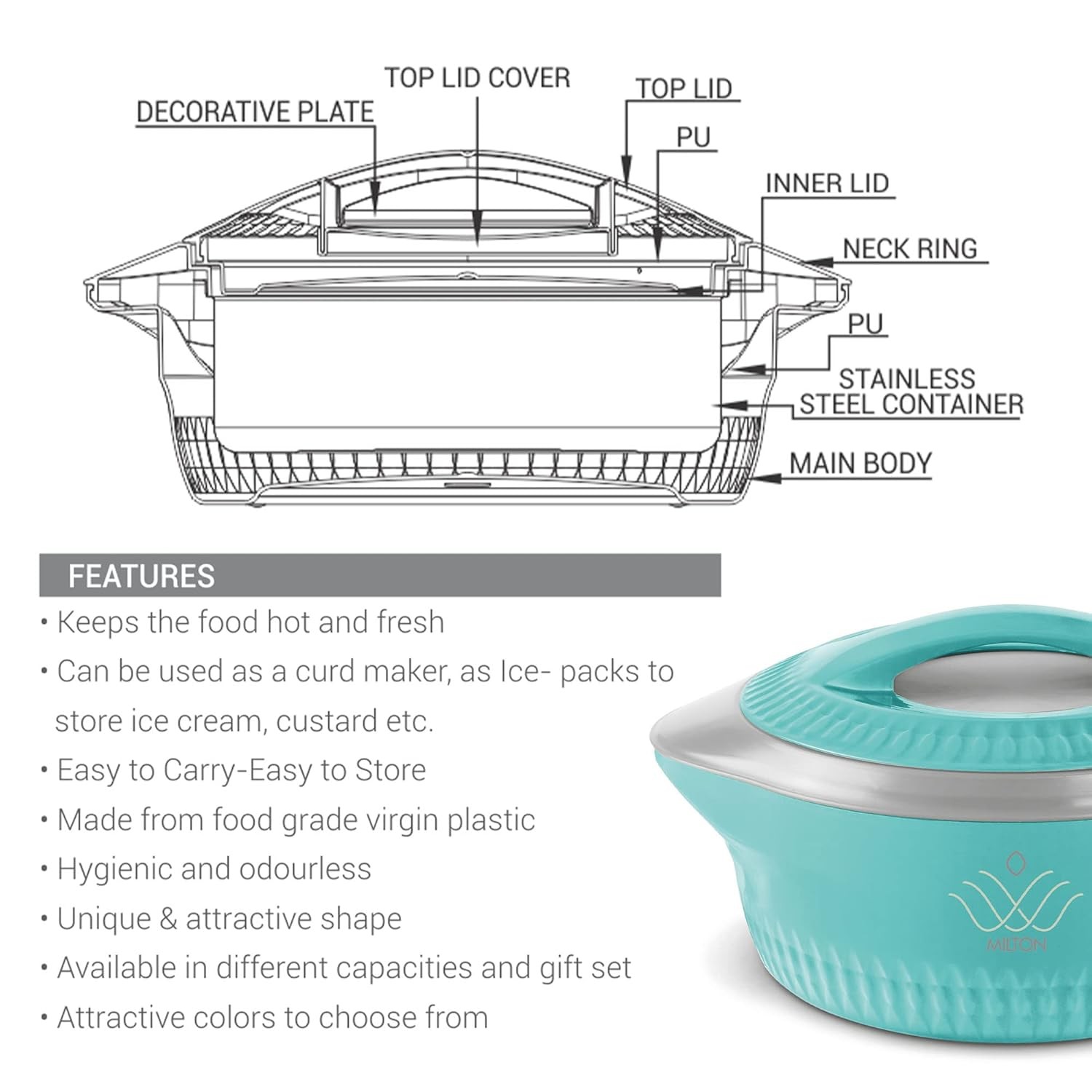 • Formal Dining: Ideal for daily use to keep rotis, biryani, rice, gravy, and pasta warm. Its elegant design also makes it suitable for special occasions, holiday meals, and dinner parties. Additionally, it is useful for picnics, barbecues, and outdoor gatherings.