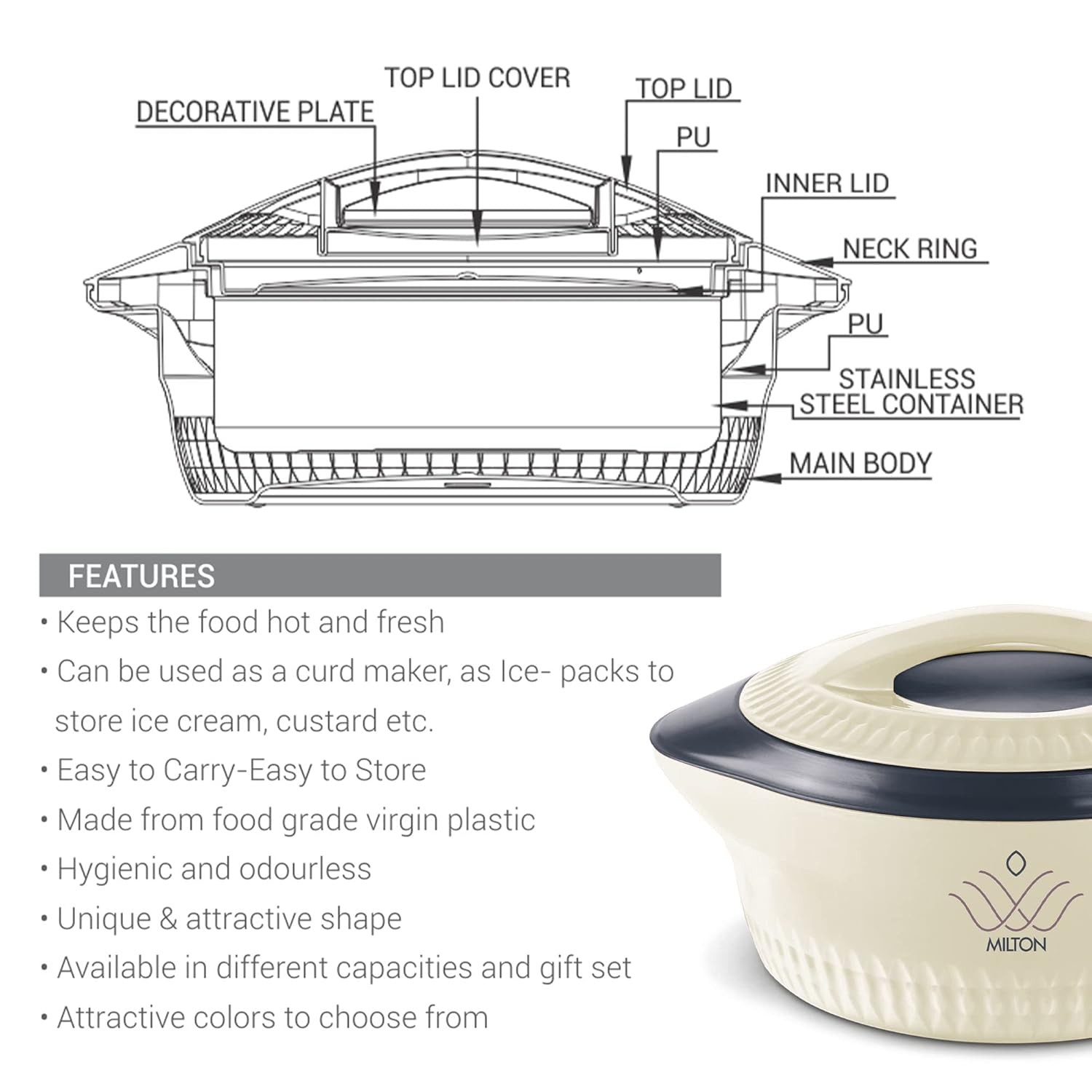 • Colour:  CREAM ; Material: Inner Stainless Steel; Package Contents: 3 - Pieces Royal Casserole (830 ml, 1.27 Litres, 1.8 Litres); Product Dimension in cms (L x W x H) 830 ml - (22.1 x 17 x 11.5), 1.27 Litres - (26.6 x 21.3 x 13), 1.8 Litres - (30 x 24 x 14)