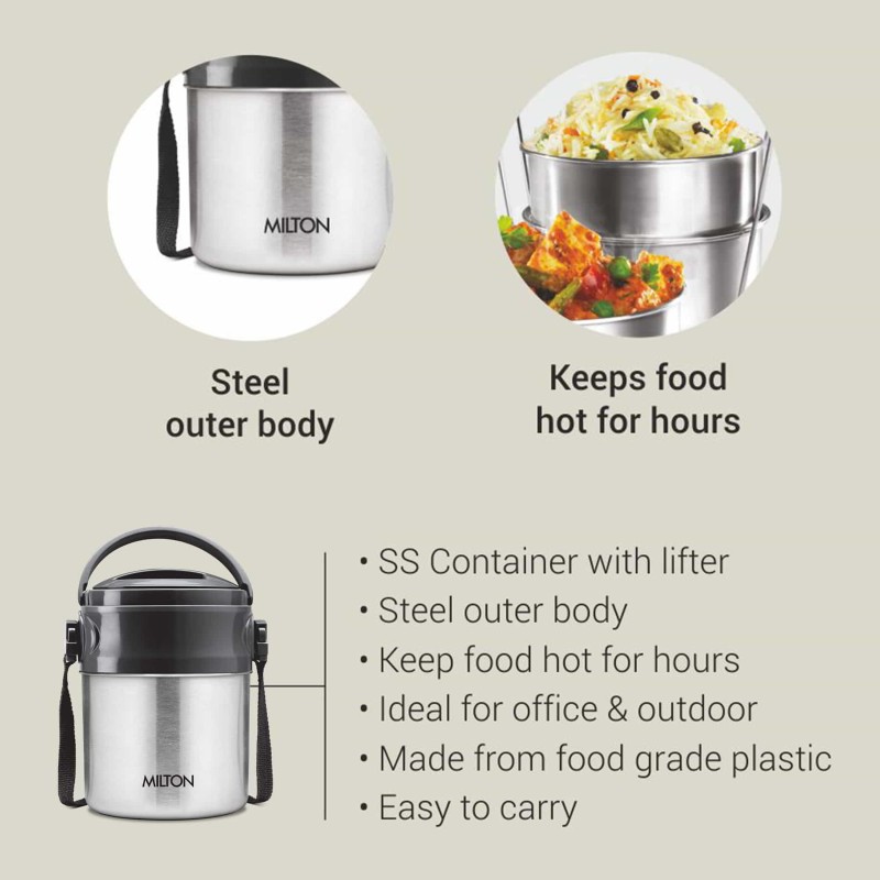 Elegant design to carry your lunch in style Insulated stainless steel lunch box, Double-walled insulated case with carry-strap. Containers in a collapsible frame, Your meal will be spill-proof and easy to handle, Contemporary brushed-steel finish and a 100% rust-resistant body.